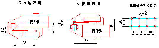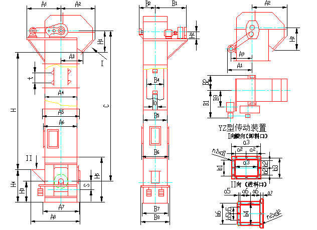 * :表中料斗容積為料斗盛水時容積。于實際填充量相近,故輸送量計算時未考慮填充系數,具體選型時應根據物料特性查表(3)求得ψ修正值以此值修正表給輸送量。 二 、提升機的結構型式圖如下、主要尺寸參數見表2、傳動裝置技術規范見表3. |